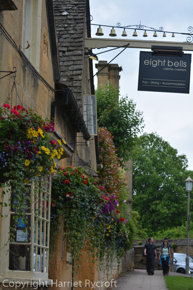 Hanging baskets outside The Eight Bells, Chipping Campden