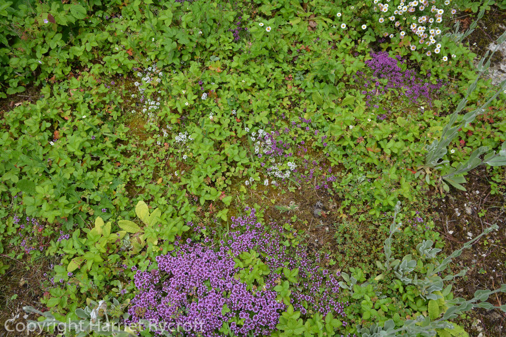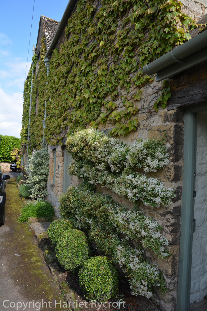 Campanula and sedum taking advantage of the joins between Grevel House and its neighbour