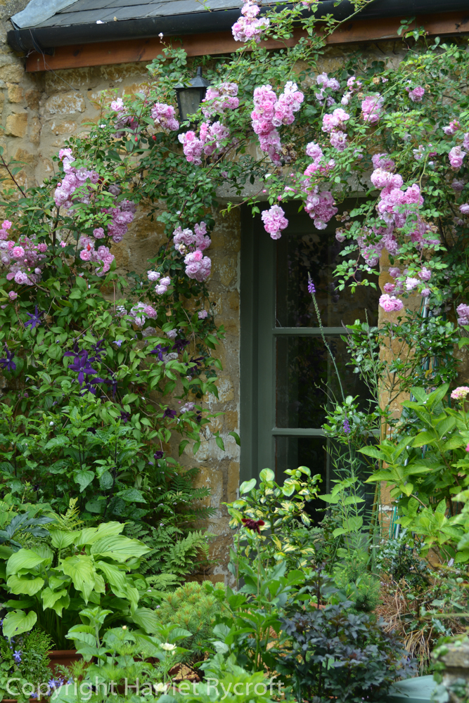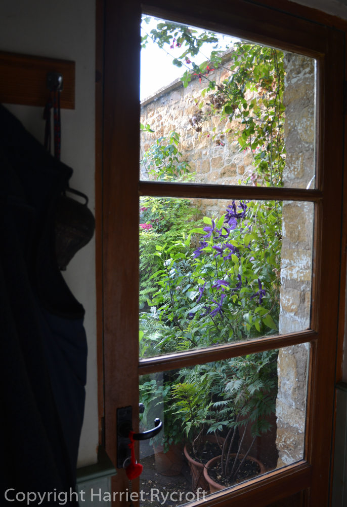 Late July through the kitchen door. The rose is past her best so the Clematis is now in negotiations with Fuchsia ‘Lady Boothby’