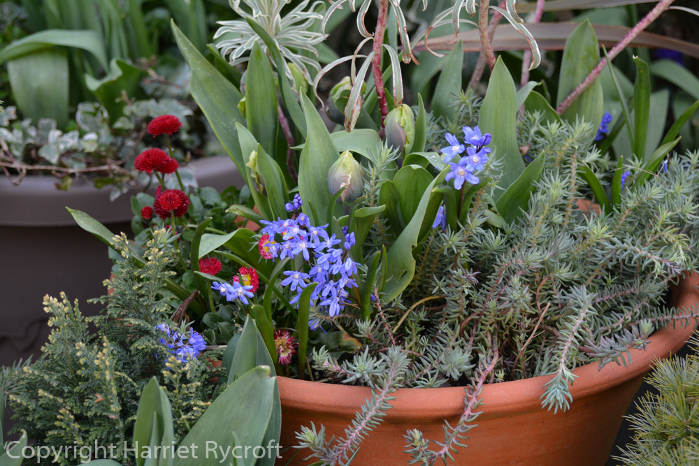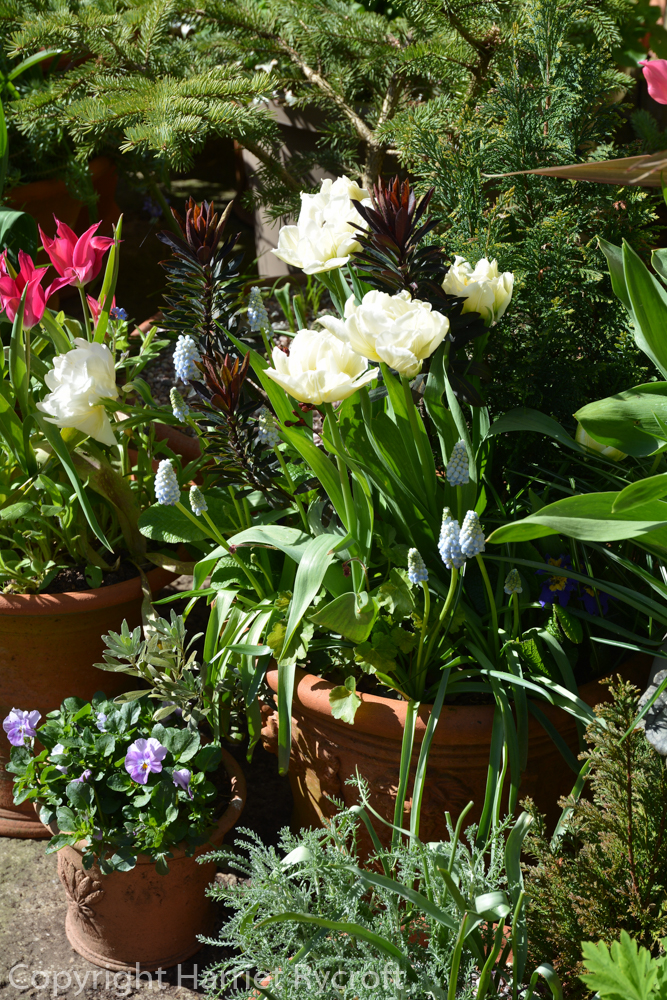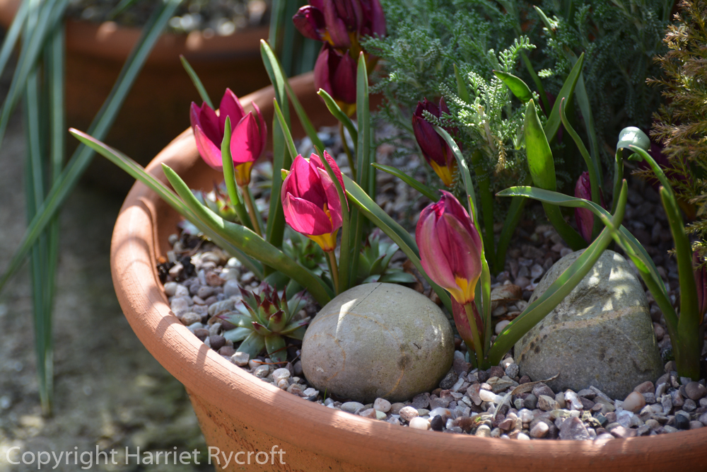 Tulipa ‘Honky Tonk’ is a little batalinii tulip, which I have grown many times before and love for its graceful habit and soft colour, with a slight warm blush on the outside of the tepals. I was glad it fitted with my theme. The smaller “species” tulips are great for shallower pots at the front of the display.
