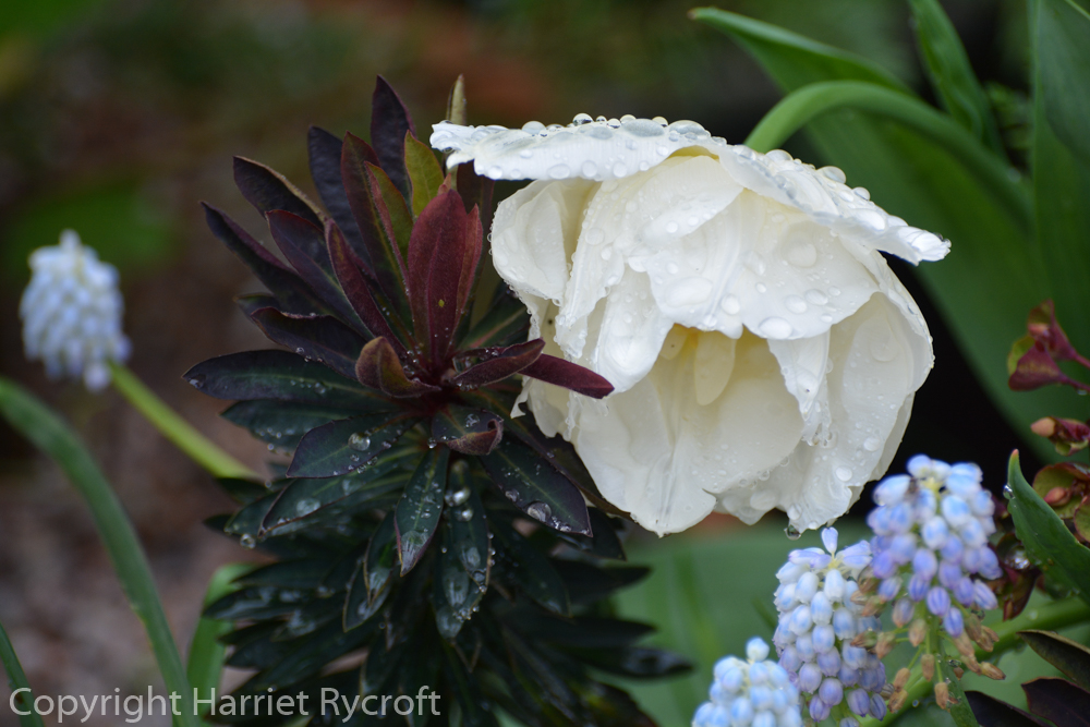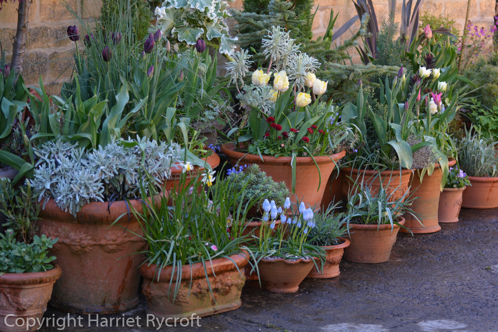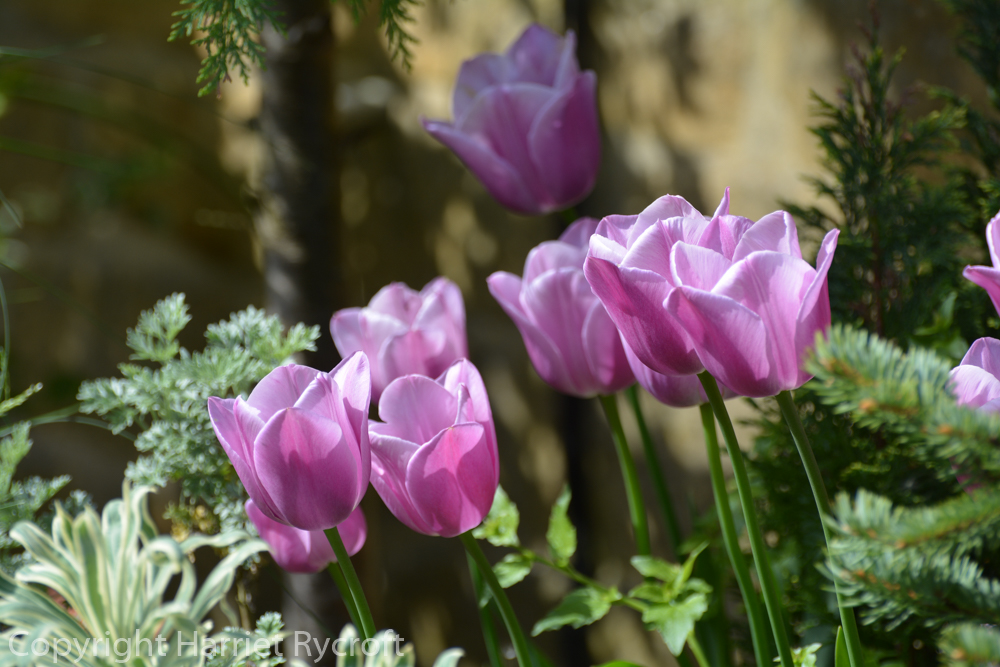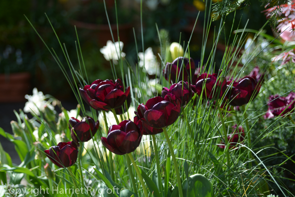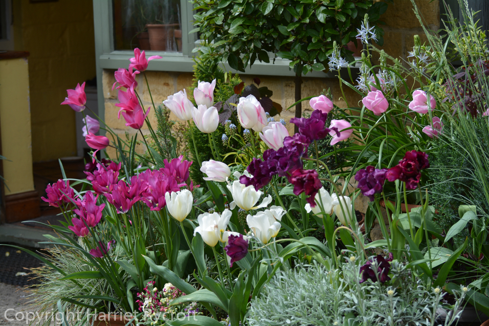 Being limited by my chosen theme made it easier to choose, and I still managed to find a wide range of flowering times – between them the tulips provided colour from the beginning of April to early June. I stirred them with grey foliage and shook in a few splashes of purple foliage, some violas and primulas, and some Narcissus and earlier flowering bulbs. I bought the vast majority of my bulbs from Peter Nyssen and was very pleased with their quality and reliability.