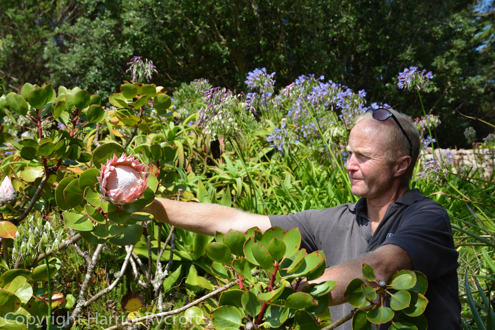I couldn’t get enough of Protea laurifolia and had to stroke it a lot: the buds are shiny and silky, but the open flower feels like a bird and looks like a bird. The bearded involucral bracts are feather-soft, and it came as no surprise to find out that there is a cultivar called ‘White Owl’. It is pollinated by Sugarbirds in the wild, who dive in, feathers in feathers, to get at the nectar at the base of the tightly-packed florets. Andrew Lawson, Head Gardener at Tresco Abbey Gardens told us that the recently introduced red squirrels in the garden have discovered why the common name for Protea is Sugarbush and regularly wreck the flowers. Suddenly the little squeedles didn’t look so sweet.