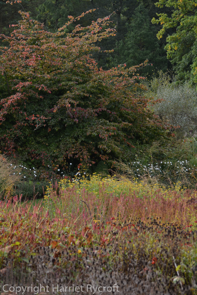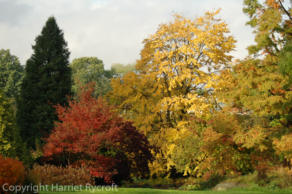 Autumn patchwork, October 2013. This year the Cercidiphyllum japonicum only had fringes of yellow when I visited.