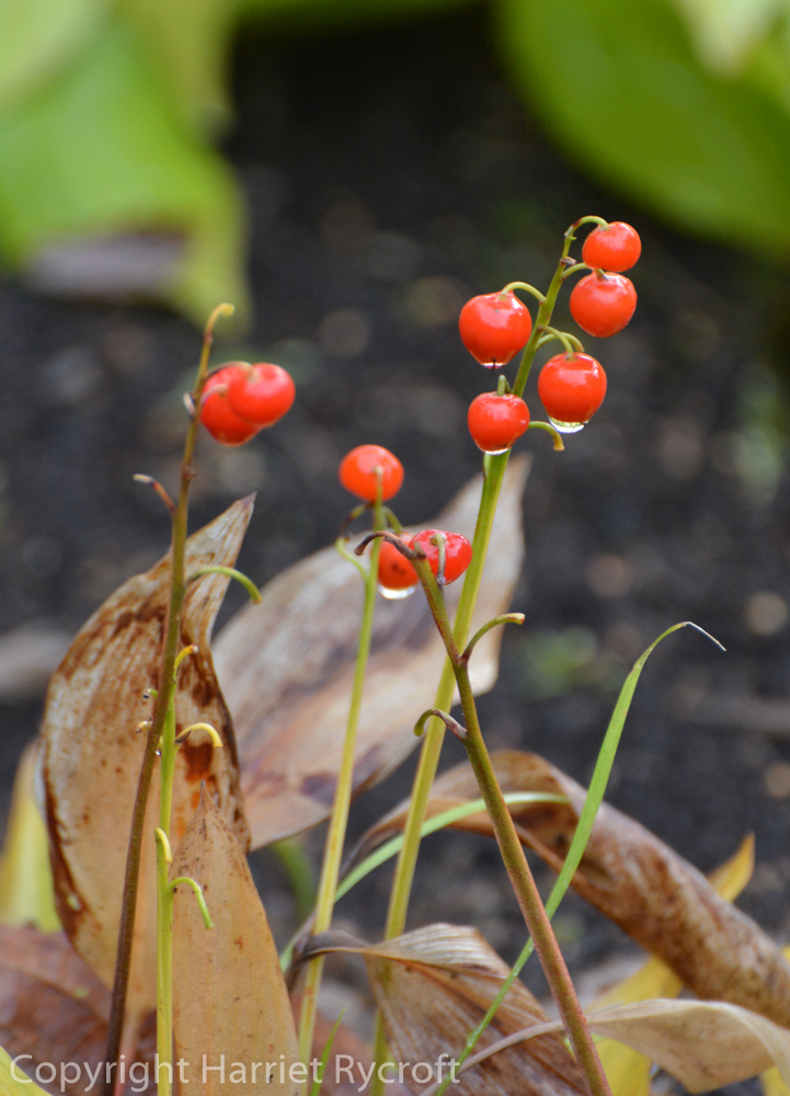 Back outside the rain grew heavier and began to felt the colours together,  I knew my time should be limited as the motorway was going to be slow and foul on a wet afternoon. I scooted about with little time to learn the names of unfamiliar plants, but I enjoyed the early autumn patchwork of trees, the crisp appliqué of acer leaves, the bright beads of Convallaria majalis and the tasselled grass heads.